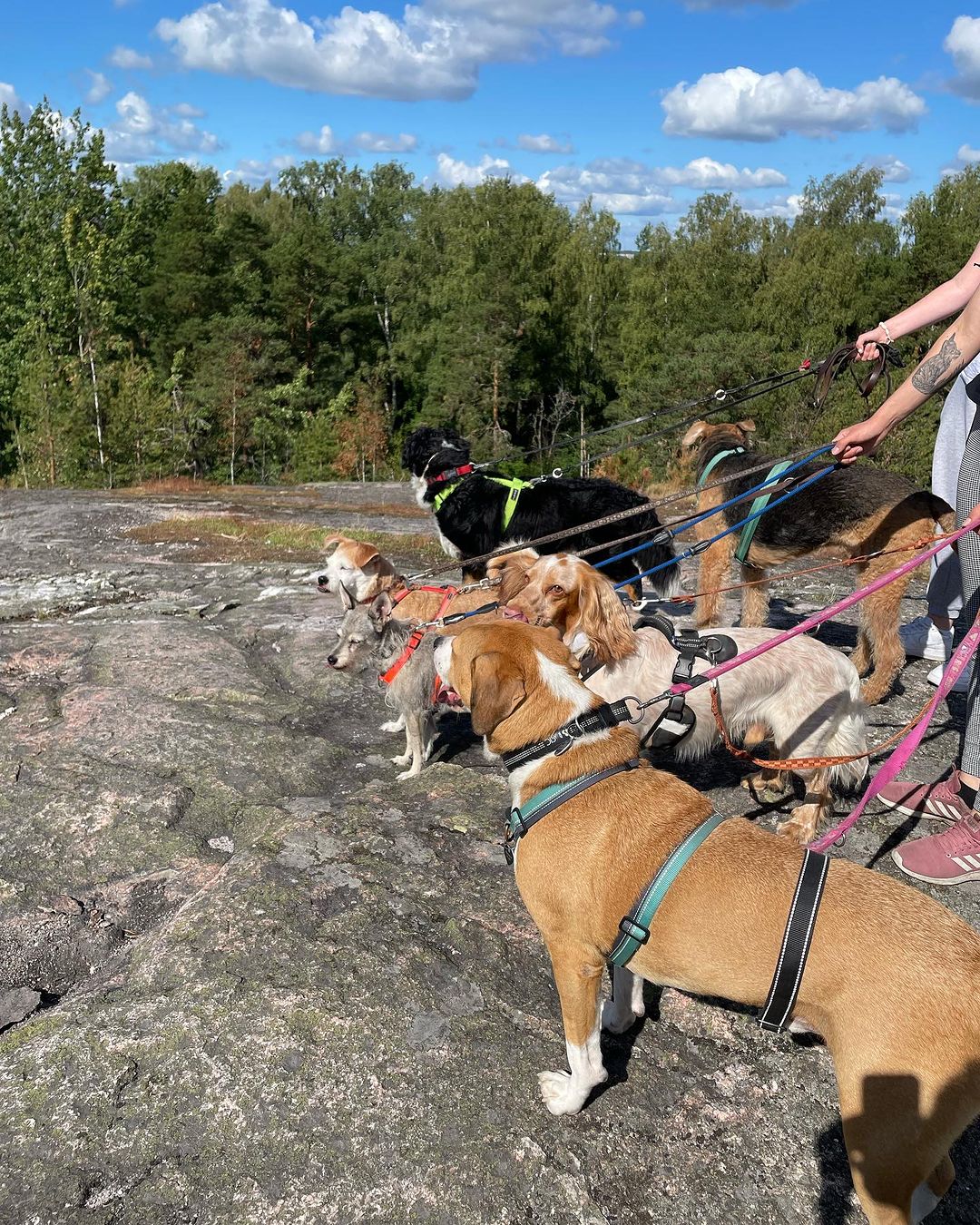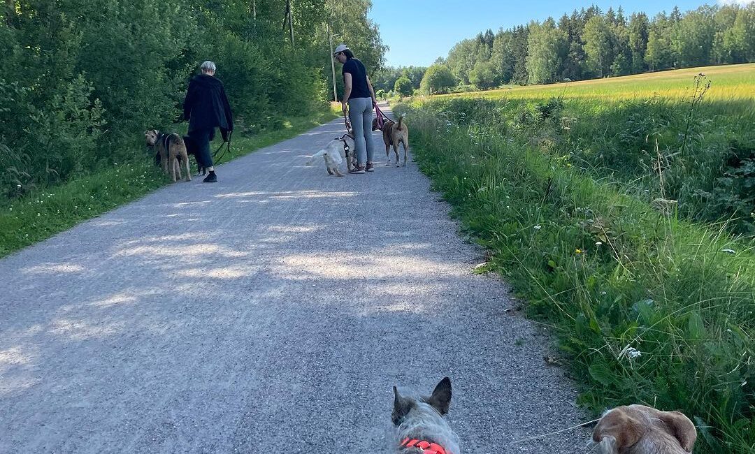 Koirahotelli herää aikaisin, yleensä n. 6.30 olemme viimeistään aamulenkillä. Sitten on aamuruoka, usein leikitään vähän aikaa, vedetään tirsat, ja kl 11 mennään varsinaiselle lenkille joko metsään, pelloille tai koirapuistoon. Olemme ulkona usein parikin tuntia.